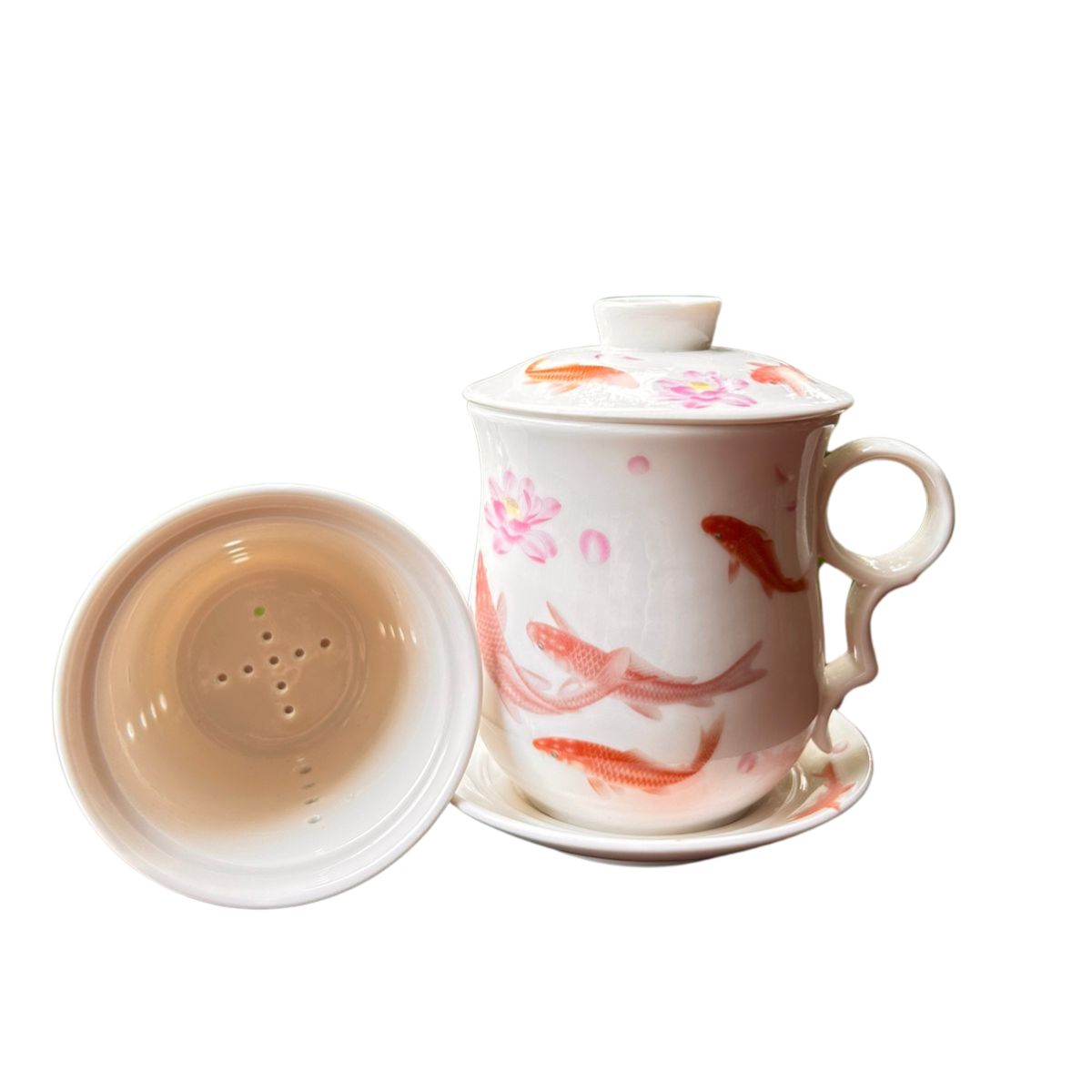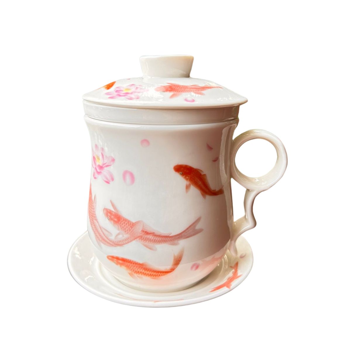 Green Tea Mug Floating Fish with Infuser, Lid, Saucer